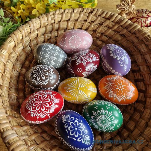 Kraslice jsou barvené kvalitními barvami, které krásně kryjí skořápku, jsou lesklé, nebarví. Jsou zdobeny bílým voskem.