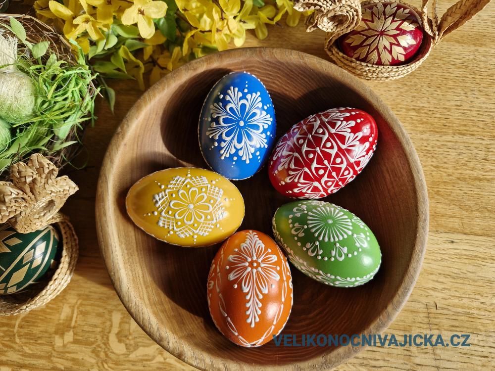 Kraslice jsou barvené kvalitními barvami, které krásně kryjí skořápku, jsou lesklé, nebarví. Jsou zdobeny bílým voskem.