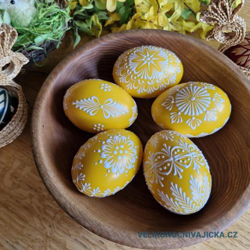 Kraslice jsou barvené kvalitními barvami, které krásně kryjí skořápku, jsou lesklé, nebarví. Jsou zdobeny bílým voskem.