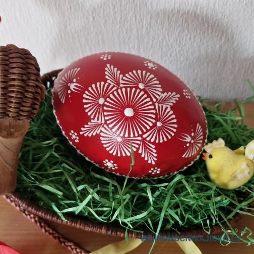 Kraslice je barvena kvalitními barvami, které krásně kryjí skořápku, jsou lesklé, nebarví. Vzor je malován bílým voskem.