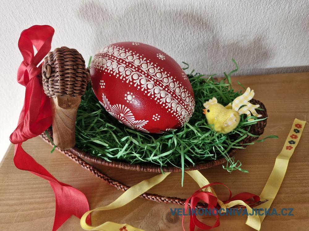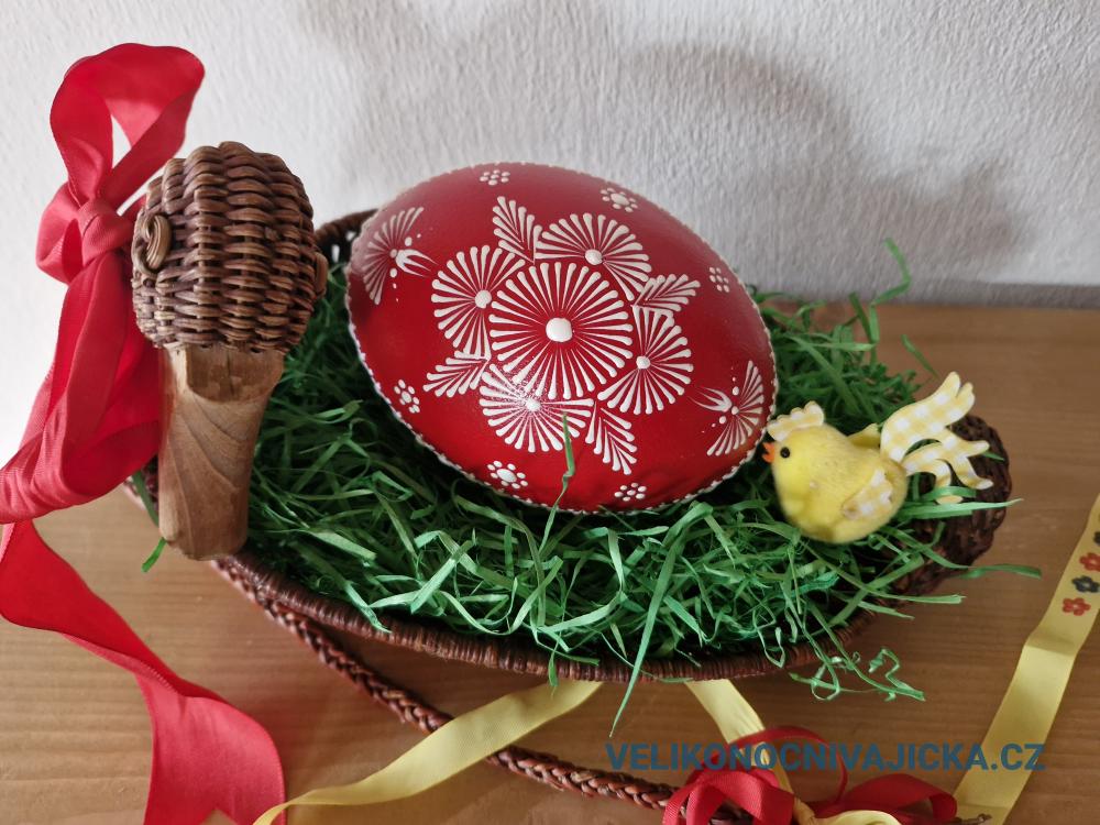 Kraslice je barvena kvalitními barvami, které krásně kryjí skořápku, jsou lesklé, nebarví. Vzor je malován bílým voskem.