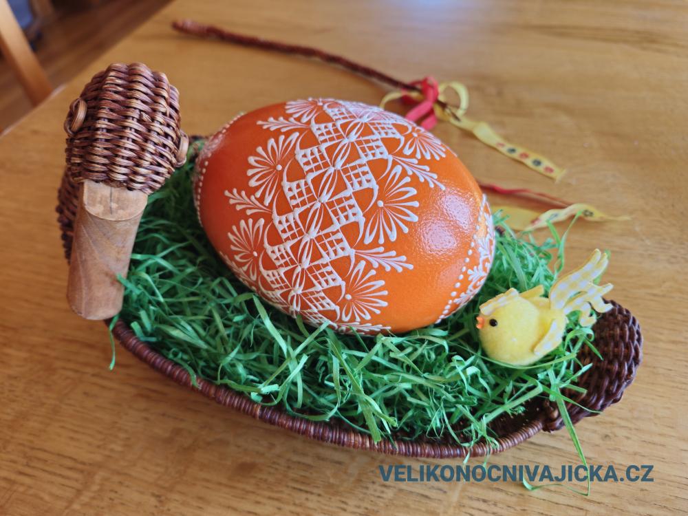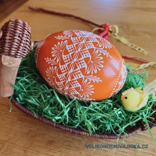 Kraslice je barvena kvalitními barvami, které krásně kryjí skořápku, jsou lesklé, nebarví. Vzor je malován bílým voskem.