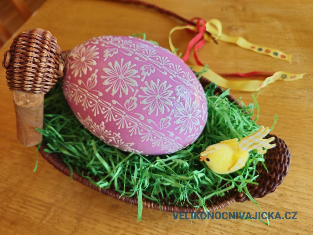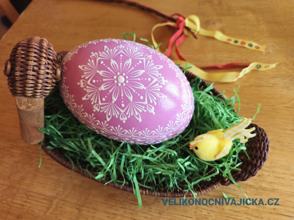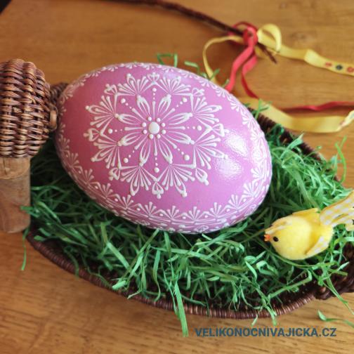 Kraslice je barvena kvalitními barvami, které krásně kryjí skořápku, jsou lesklé, nebarví. Vzor je malován bílým voskem.