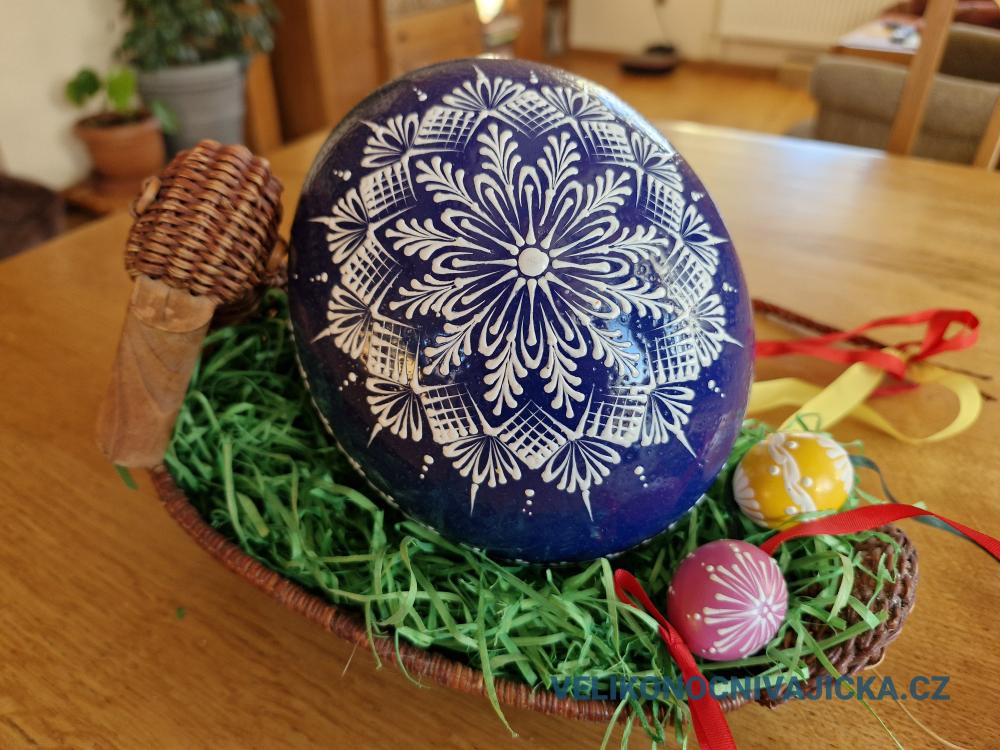 Kraslice je barvena kvalitními barvami, které krásně kryjí skořápku, jsou lesklé, nebarví. Vzor je malován bílým voskem.