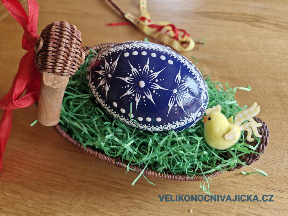 Kraslice je barvena kvalitními barvami, které krásně kryjí skořápku, jsou lesklé, nebarví. Vzor je malován bílým voskem.
