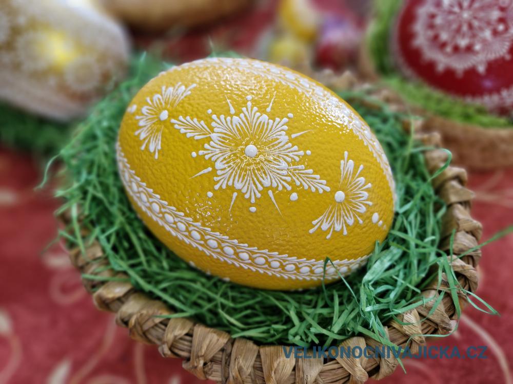 Kraslice je barvena kvalitními barvami, které krásně kryjí skořápku, jsou lesklé, nebarví. Vzor je malován bílým voskem.