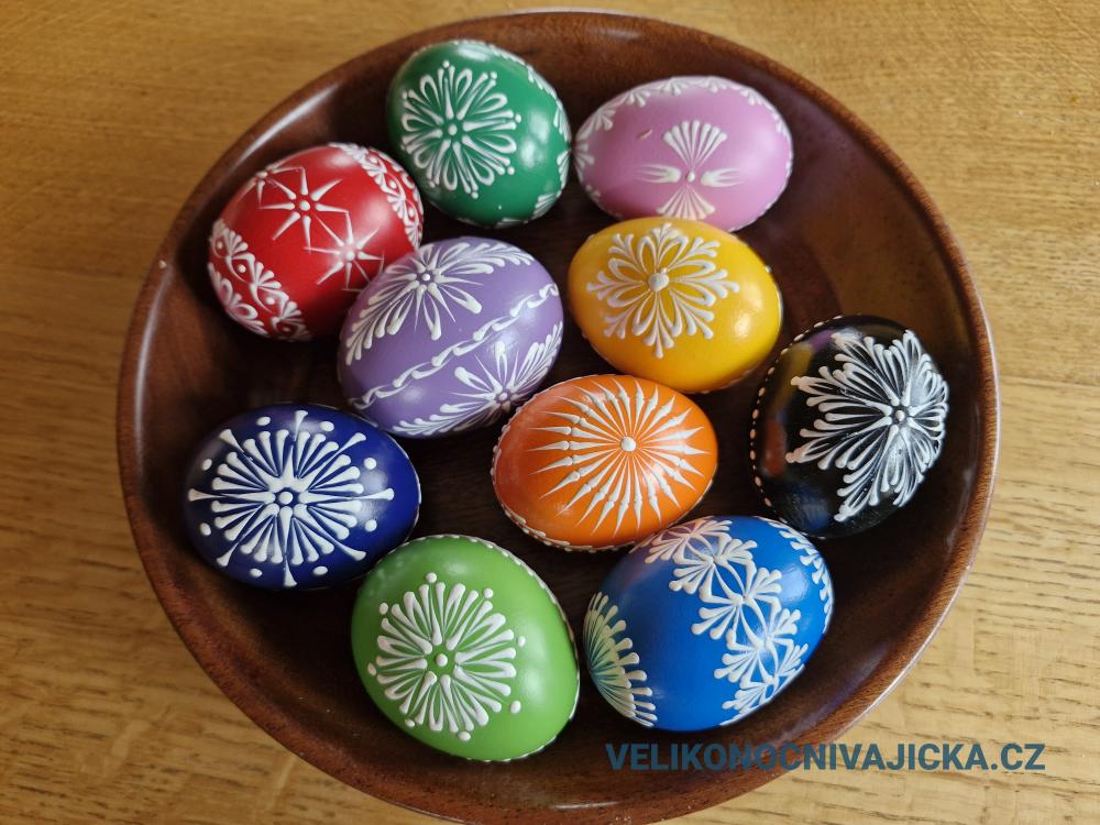 Kraslice jsou barvené kvalitními barvami, které krásně kryjí skořápku, jsou lesklé, nebarví. Vzory jsou malovány bílým voskem.