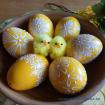 Kraslice jsou barvené kvalitními barvami, které krásně kryjí skořápku, jsou lesklé, nebarví. Kraslice maluji bílým voskem.